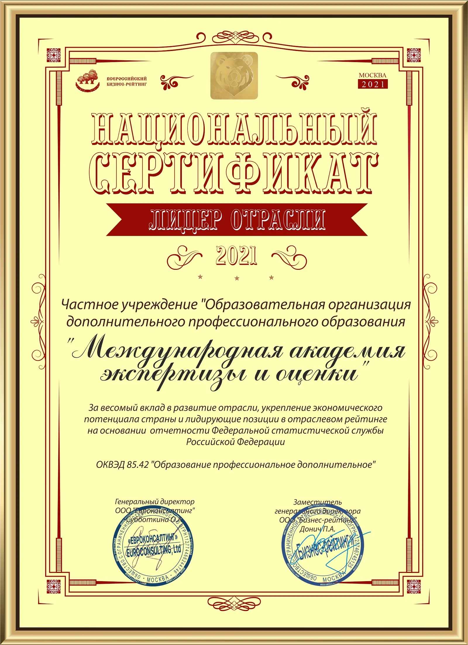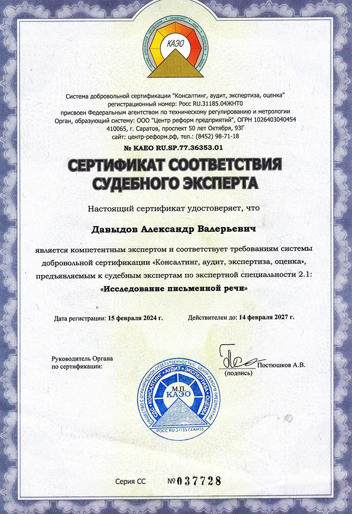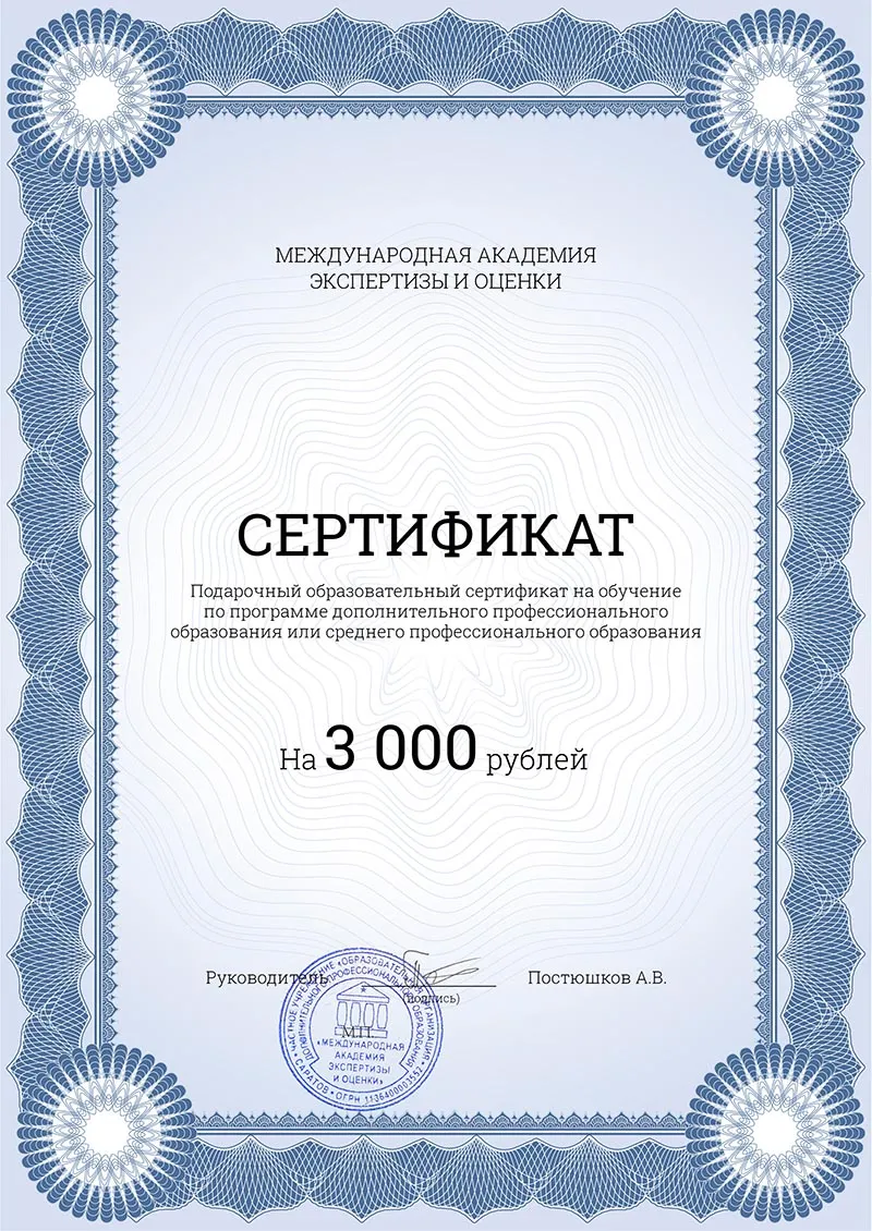 В подарок нашим ученикам вместе с дипломом выдаем квалификационный сертификат судебного эксперта. У нас своя система сертификации «Консалтинг, аудит, экспертиза, оценка», зарегистрированная в Росстандарте. В сертификате будет указана один конкретный вид судебной экспертизы из перечня, утвержденного приказом Минюста России № 137 от 27.12.2012 г.